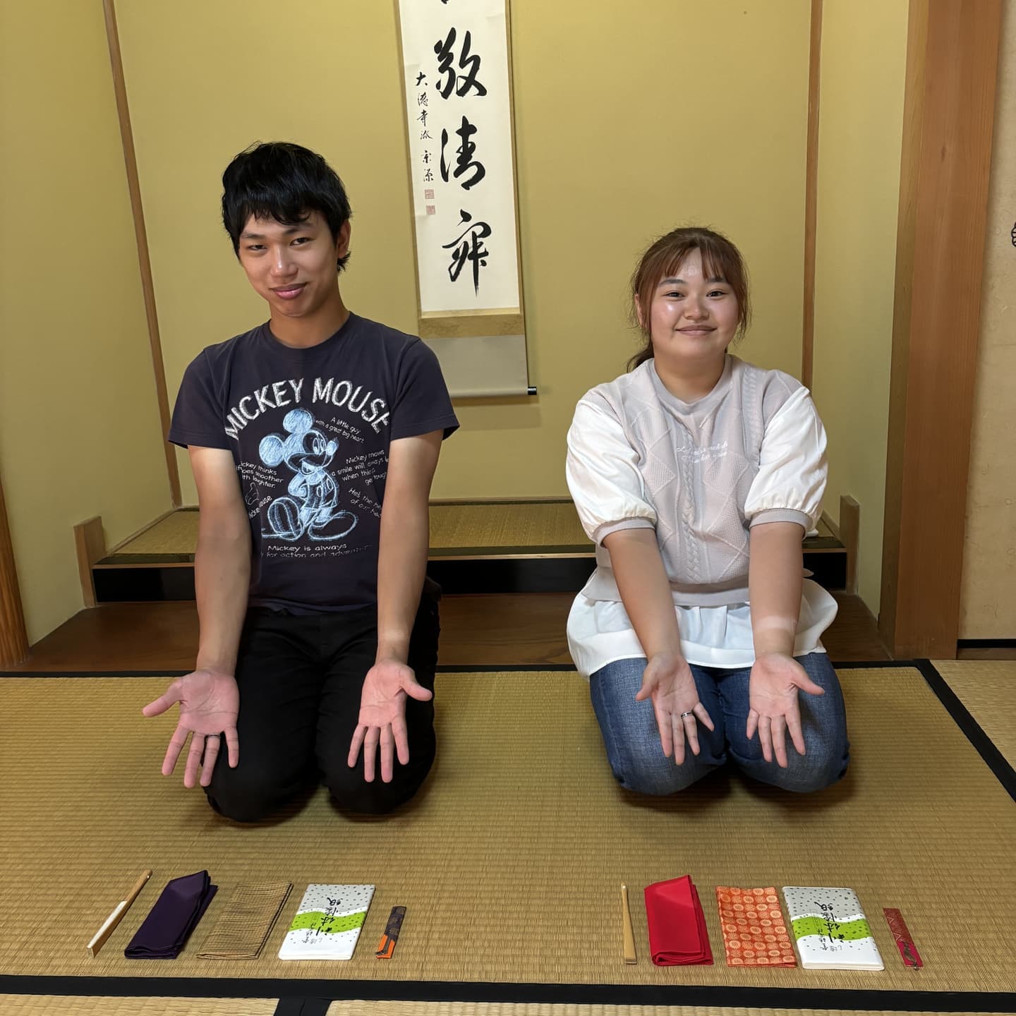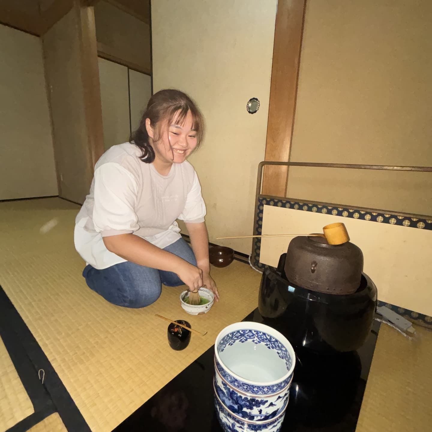 お客様ご自身でお茶を点てて飲んでいただきます。茶杓を使い、棗から茶碗に抹茶を入れます。そして、柄杓を使って釜からお湯を入れて頂きます。柄杓を使ってお湯を汲むのは結構楽しいですよ!次に茶筅を使って茶を点てます。さあ、出来上がりです。お菓子と共にお楽しみ下さい!